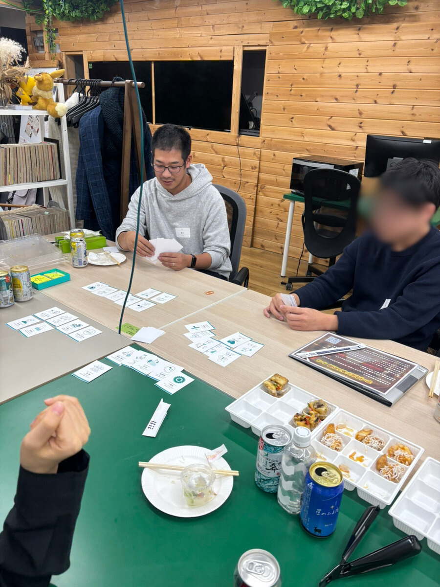 カードをめくりながら、学生と社員がリラックスした雰囲気の中、お互いの制作や日常について語り合いました。
