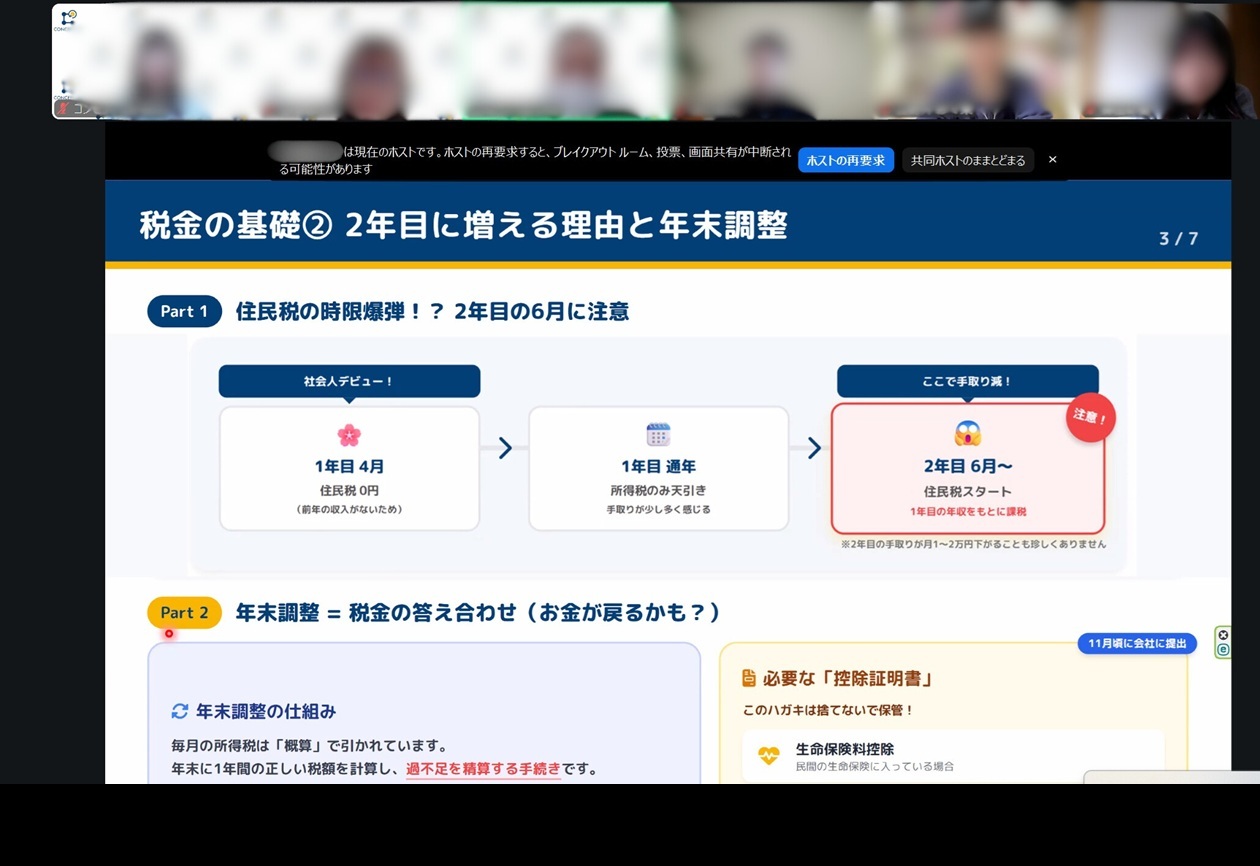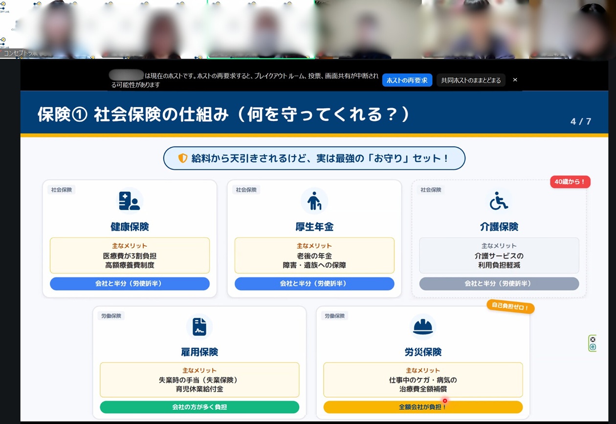 具体的には、給与から差し引かれる税金や社会保険の仕組みなど、社会人として知っておくと安心な制度についてお話しするとともに、入社時に提出していただく各種書類についても画面を見ながらご案内しました。